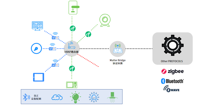 在网络层,Matter协议基于IP架构,可无缝兼容Wi-Fi、Thread和BLE等底层无线通信协议,令其不再是非此即彼的竞争关系,其中:Wi-Fi负责高带宽设备的数据传输,Thread负责构建低功耗的Mesh网络,BLE用于便捷快速的设备配网工作。此外,Matter还可使用Matter Brige桥接Zigbee、Z-Wave等非IP无线通信协议。