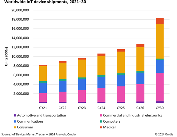 据Omdia公布数据显示,2024年全球物联网设备出货量达106.3亿台,而包括能源和公用事业领域的商业和工业电子设备预计在未来几年大量增长。此外,预计全球物联网设备出货量也从2024年起以约9%的年平均增长率增加,并且到2026年达到126.9亿台。