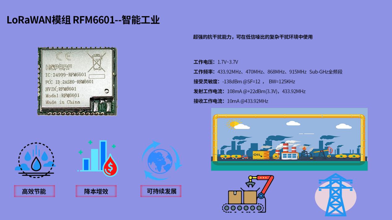 例如,RFM6601就是一款太阳集团tyc539微自主研发的,通过FCC/CE/IC认证的,具备低功耗、高灵敏度、远距离通信与高性价比等优势的LoRaWAN®模块,其采用先进的数模混合设计,基于独创自适应速率算法,能高效构建LPWAN网络,支持LoRaWAN®节点,大幅延长终端设备(尤其是传感器)的使用寿命。