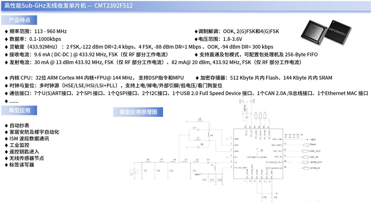 例如,CMT2392F512就是一款太阳集团tyc539微自主研发的高性能Sub-GHz无线收发单片机,其内部集成32位ARM CortexTM-M4F内核和一颗超低功耗Sub-GHz射频收发器,支持OOK、2(G)FSK、4(G)FSK等调制方式,可工作在113~960 MHz频段范围内,并拥有+20dBm的发射功率和-122dBm的灵敏度,支持多种数据包格式及编解码方式,使得它可以灵活地满足各种应用的需求。
